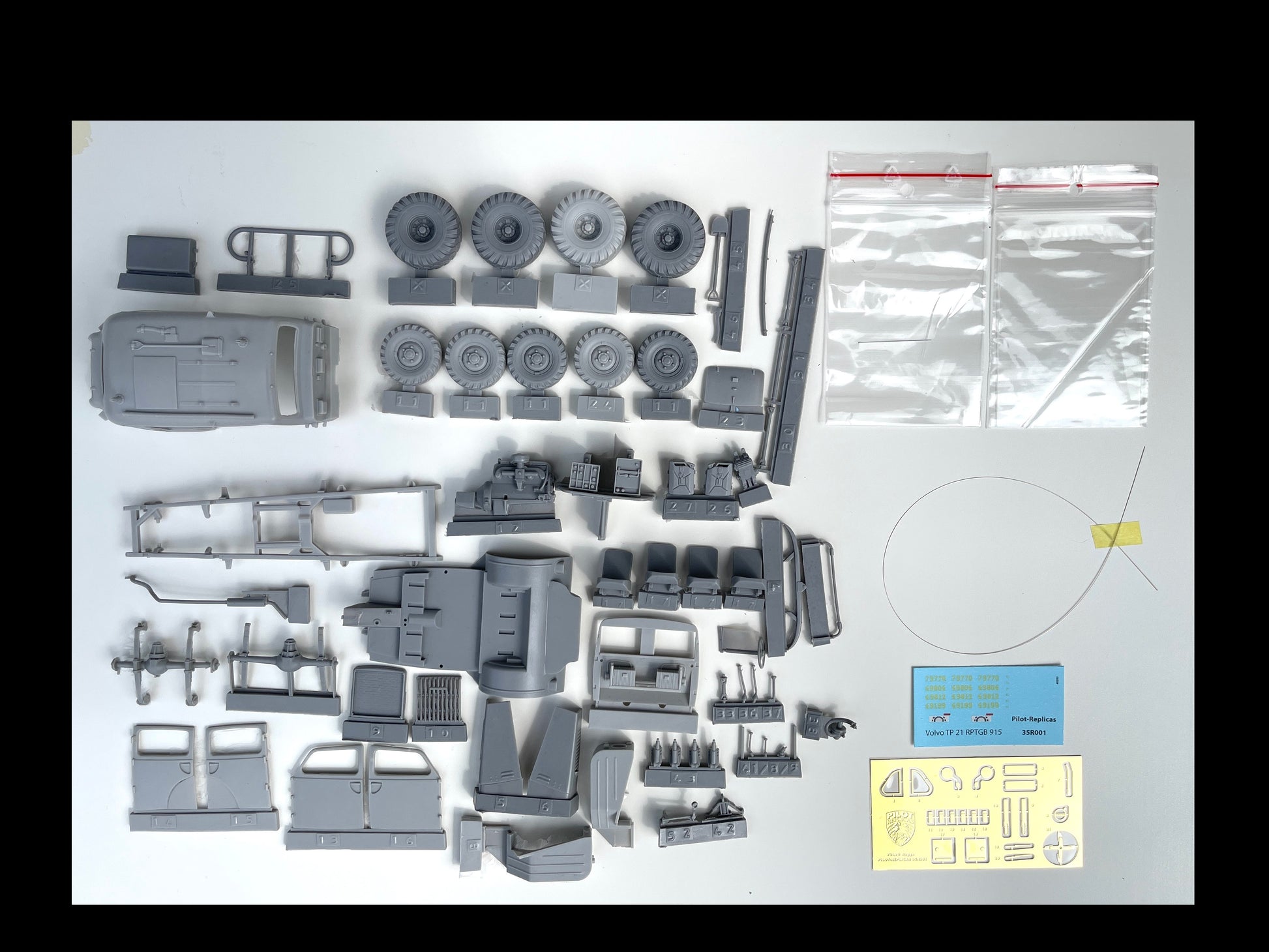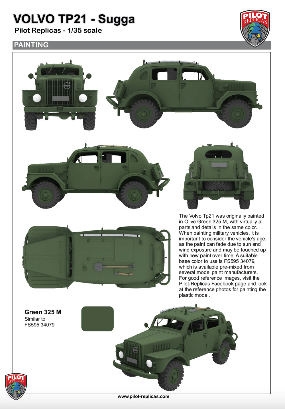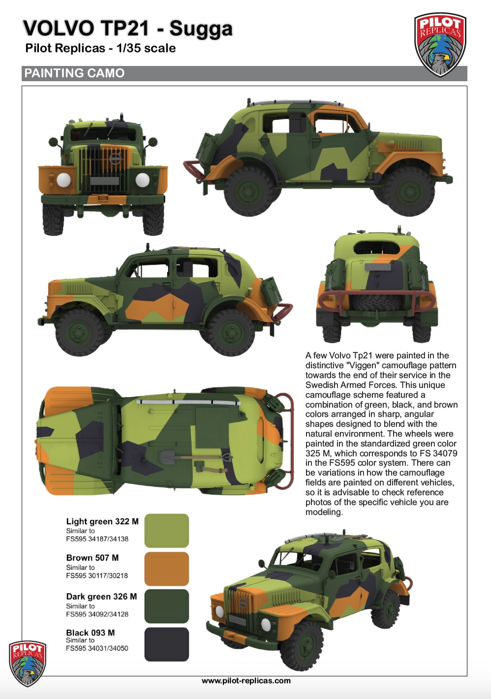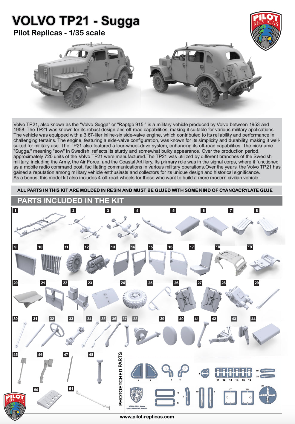 Volvo TP21, also known as the "Volvo Sugga" or "Raptgb 915," is a military vehicle produced by Volvo between 1953 and 1958. The TP21 was known for its robust design and off‑road capabilities, making it suitable for various military applications.The vehicle was equipped with a 3.67‑liter inline‑six side‑valve engine, which contributed to its reliability and performance in challenging terrains. The engine, featuring a side‑valve configuration, was known for its simplicity and durability, making it wellsuited for military use. The TP21 also featured a four‑wheel‑drive system, enhancing its off‑road capabilities. The nickname "Sugga," meaning "sow" in Swedish, reflects its sturdy and somewhat bulky appearance. Over the production period, approximately 720 units of the Volvo TP21 were manufactured.The TP21 was utilized by different branches of the Swedish military, including the Army, the Air Force, and the Coastal Artillery. Its primary role was in the signal corps, where it functioned as a mobile radio command post, facilitating communications in various military operations.Over the years, the Volvo TP21 has gained a reputation among military vehicle enthusiasts and collectors for its unique design and historical significance. As a bonus, this model kit also includes 4 off‑road wheels for those who want to build a more modern civilian vehicle.