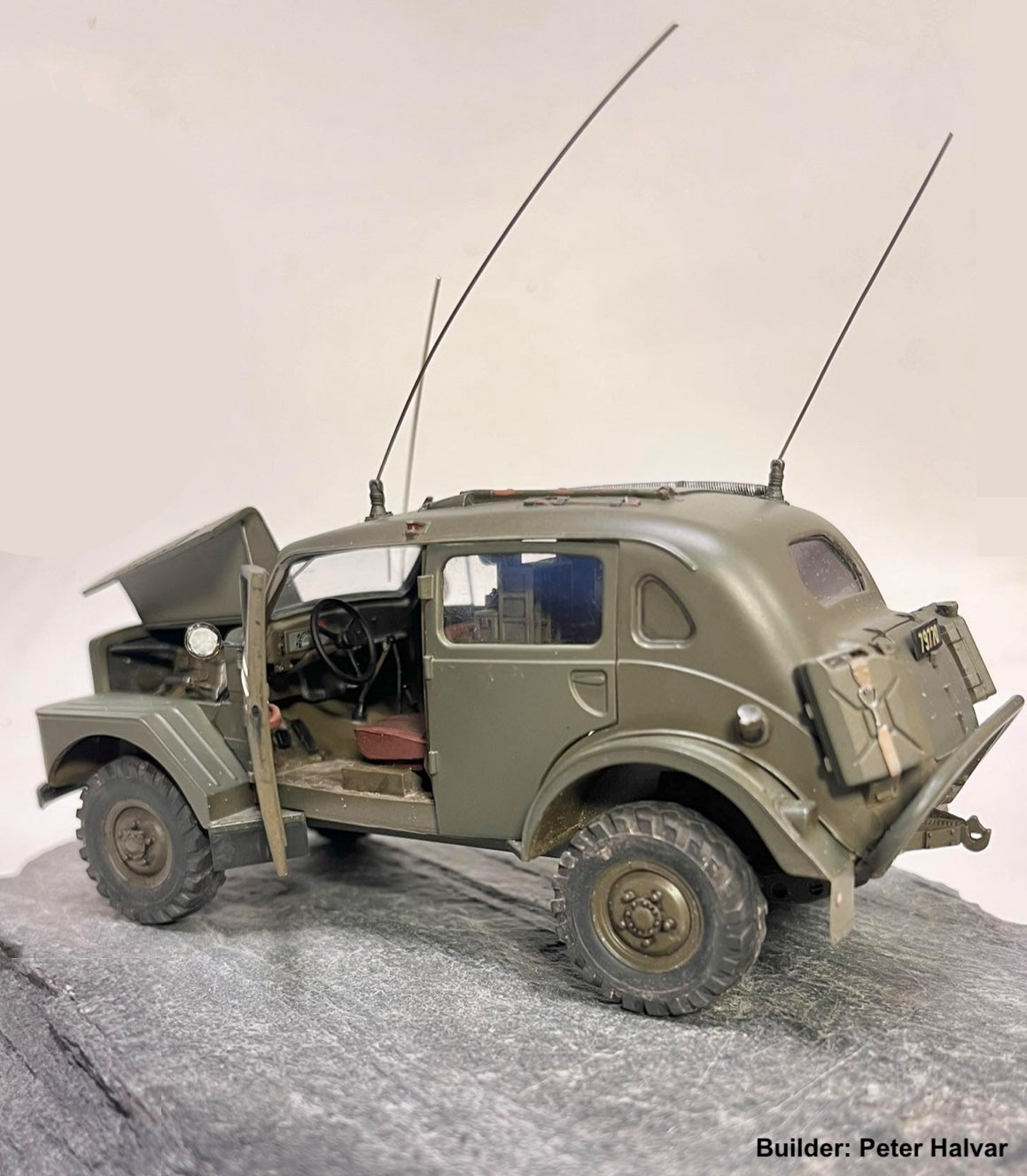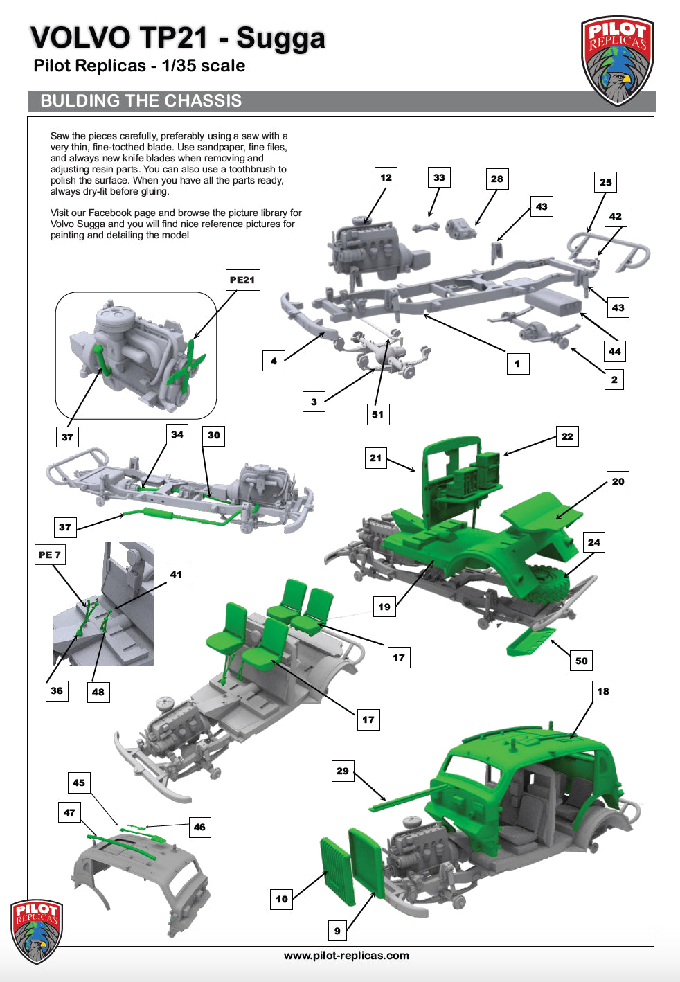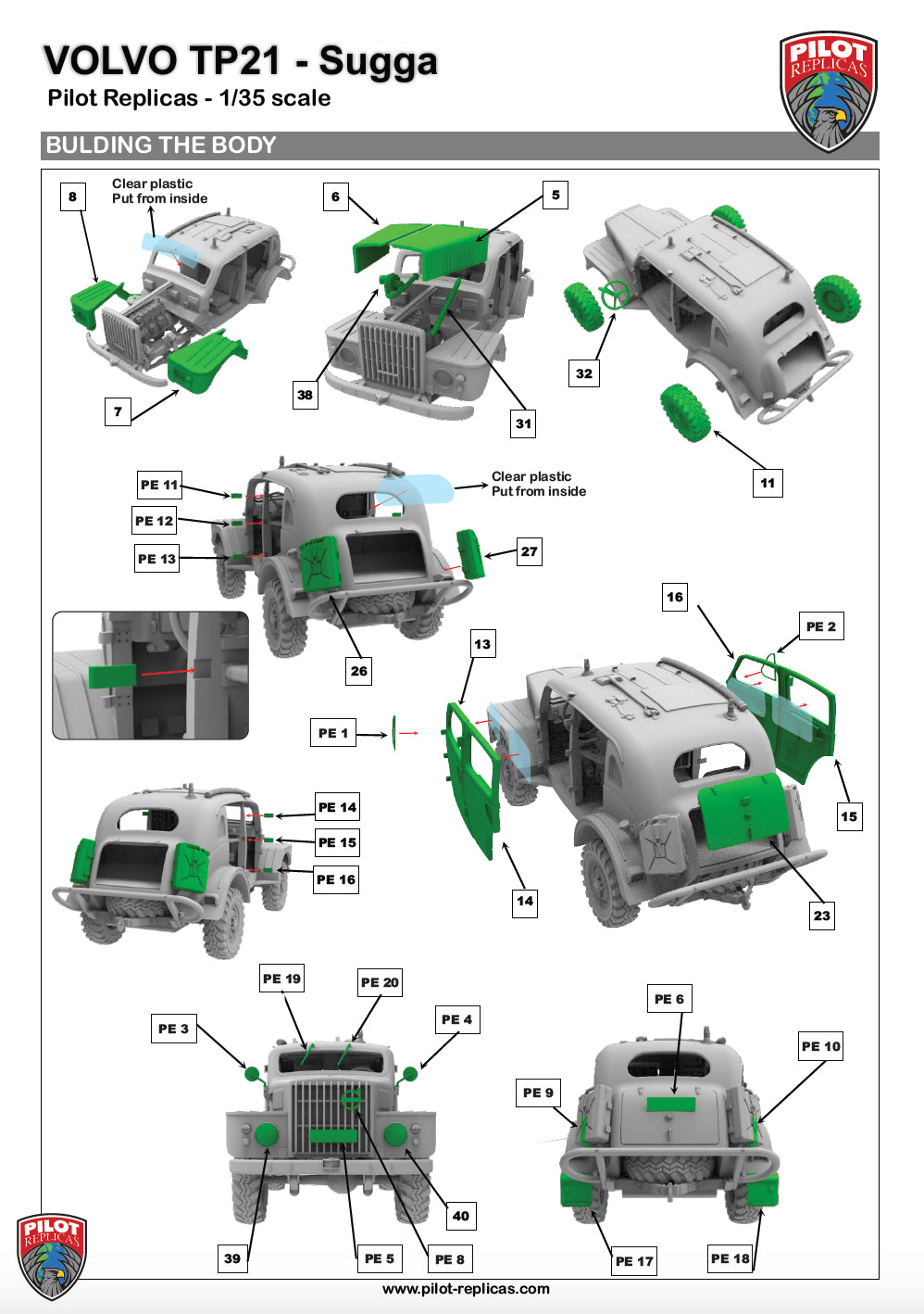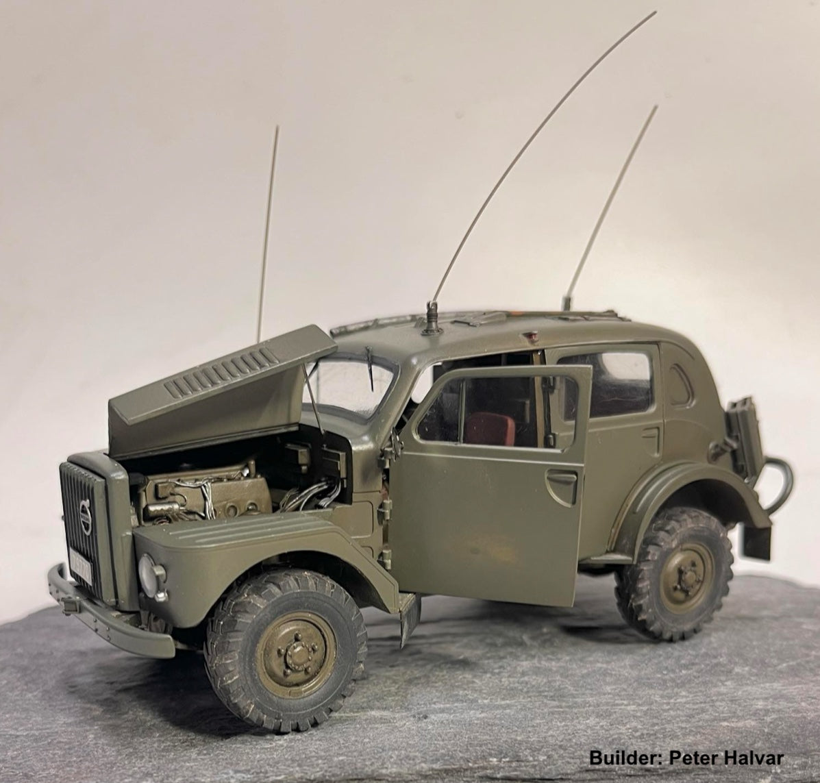 Volvo TP21, also known as the "Volvo Sugga" or "Raptgb 915," is a military vehicle produced by Volvo between 1953 and 1958. The TP21 was known for its robust design and off‑road capabilities, making it suitable for various military applications.The vehicle was equipped with a 3.67‑liter inline‑six side‑valve engine, which contributed to its reliability and performance in challenging terrains. The engine, featuring a side‑valve configuration, was known for its simplicity and durability, making it wellsuited for military use. The TP21 also featured a four‑wheel‑drive system, enhancing its off‑road capabilities. The nickname "Sugga," meaning "sow" in Swedish, reflects its sturdy and somewhat bulky appearance. Over the production period, approximately 720 units of the Volvo TP21 were manufactured.The TP21 was utilized by different branches of the Swedish military, including the Army, the Air Force, and the Coastal Artillery. Its primary role was in the signal corps, where it functioned as a mobile radio command post, facilitating communications in various military operations.Over the years, the Volvo TP21 has gained a reputation among military vehicle enthusiasts and collectors for its unique design and historical significance. As a bonus, this model kit also includes 4 off‑road wheels for those who want to build a more modern civilian vehicle.